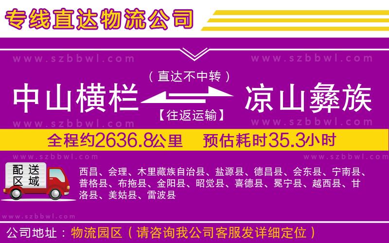 中山至涼山彝族自治州貨運公司全程約2646.8公里,專線運輸用時大約35.4小時,可運輸直達西昌、會理、木里藏族自治縣、鹽源縣、德昌縣、會東縣、寧南縣、普格縣、布拖縣、金陽縣、昭覺縣、喜德縣、冕寧縣、越西縣、甘洛縣、美姑縣、雷波縣;百邦物流可承接:整車運輸、零擔(dān)運輸、大件運輸、轎車托運、危險品運輸、